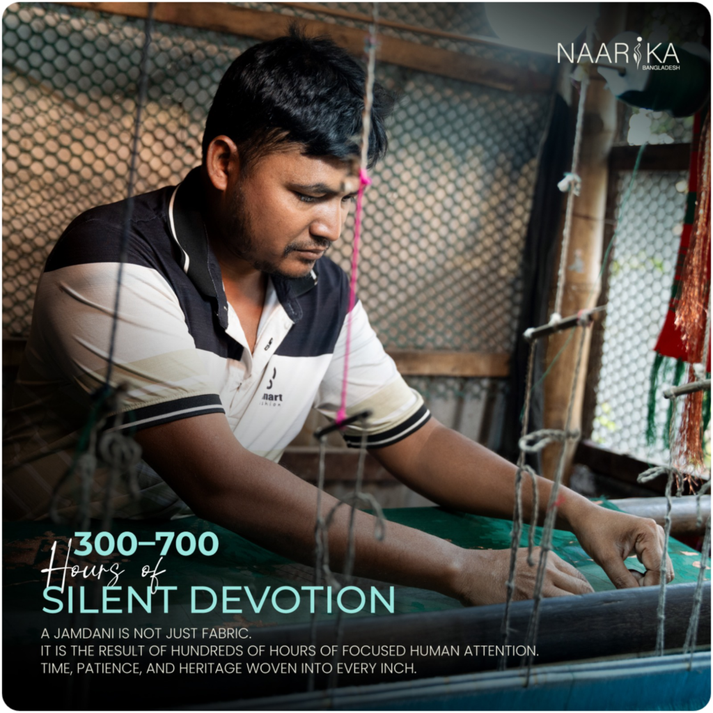 A single Jamdani takes approximately 300 to 700 hours to complete. There is no rush.